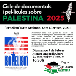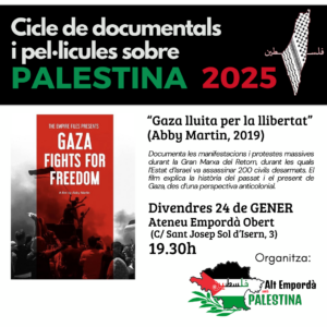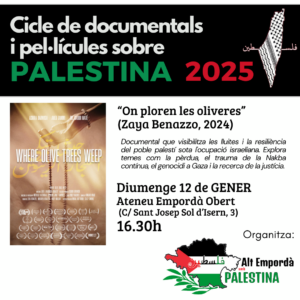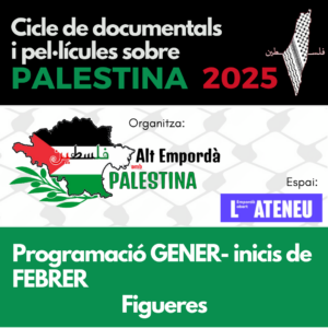 Des de la plataforma “Alt Empordà amb Palestina” saludem el nou any 2025 anunciant el cicle de pel·lícules i documentals sobre Palestina i l’ocupació sionista. Al llarg dels propers mesos, entre altres activitats que ja anirem fent públiques, organitzarem aquests cinefòrums per donar a conèixer la realitat de Palestina a través del cinema, abordant la història i el present de la regió.